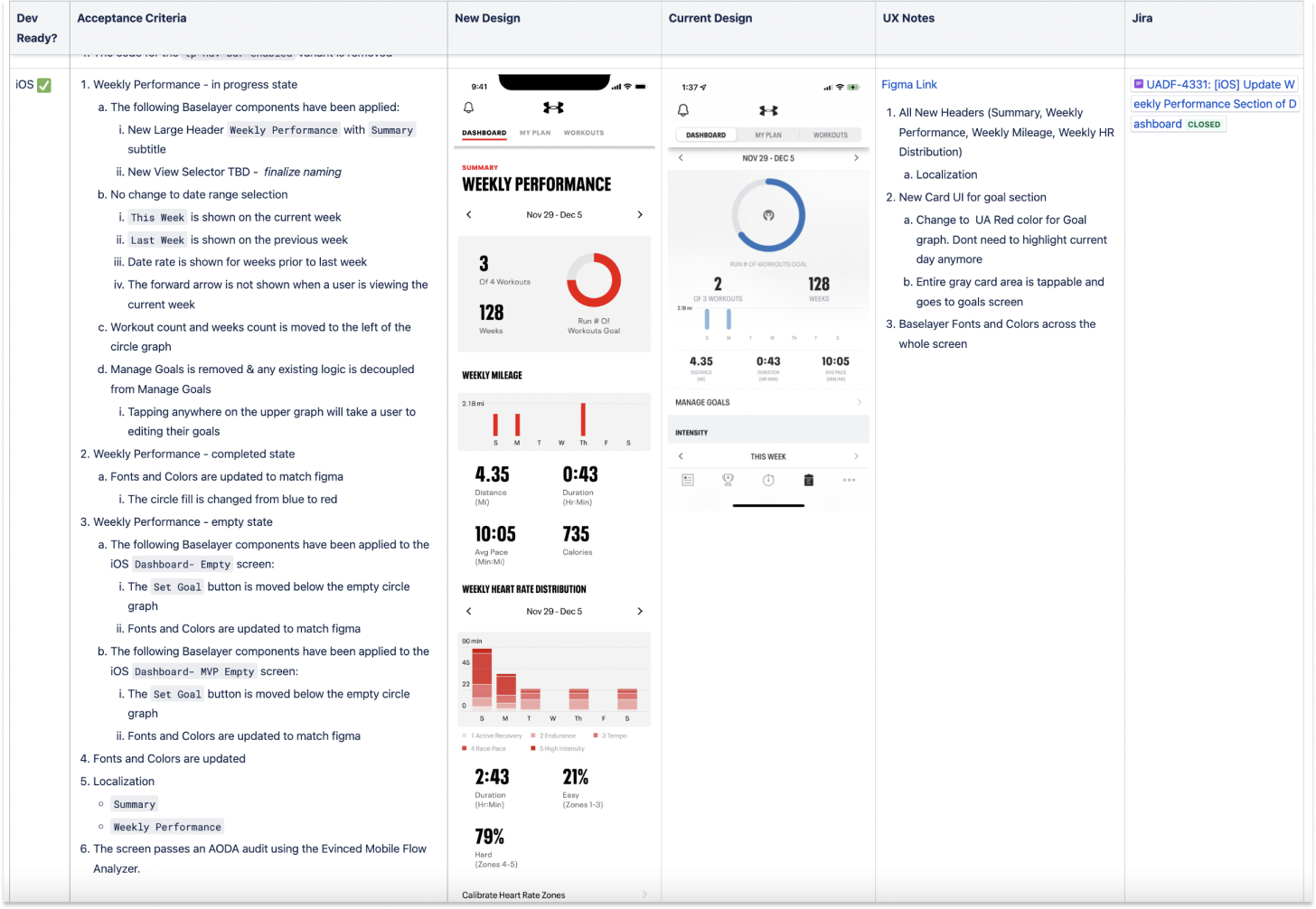 Then I would document before and after designs with direct links to the appropriate Figma files. Figma files would include more detailed design notes, but confluence served all teams best as a source of truth that we could all edit and reference as we moved through production.